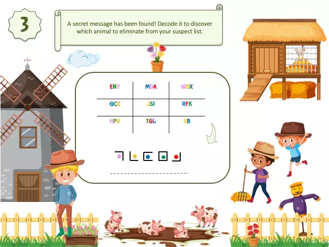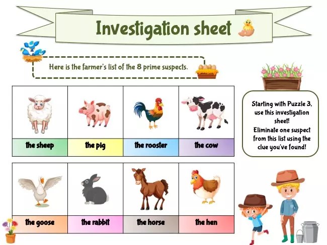 For younger players, discover our Farm Investigation Game for Kids, a version specially designed for 6–7-year-olds with simpler clues and age-appropriate puzzles to enjoy the same farmyard mystery at their own pace.